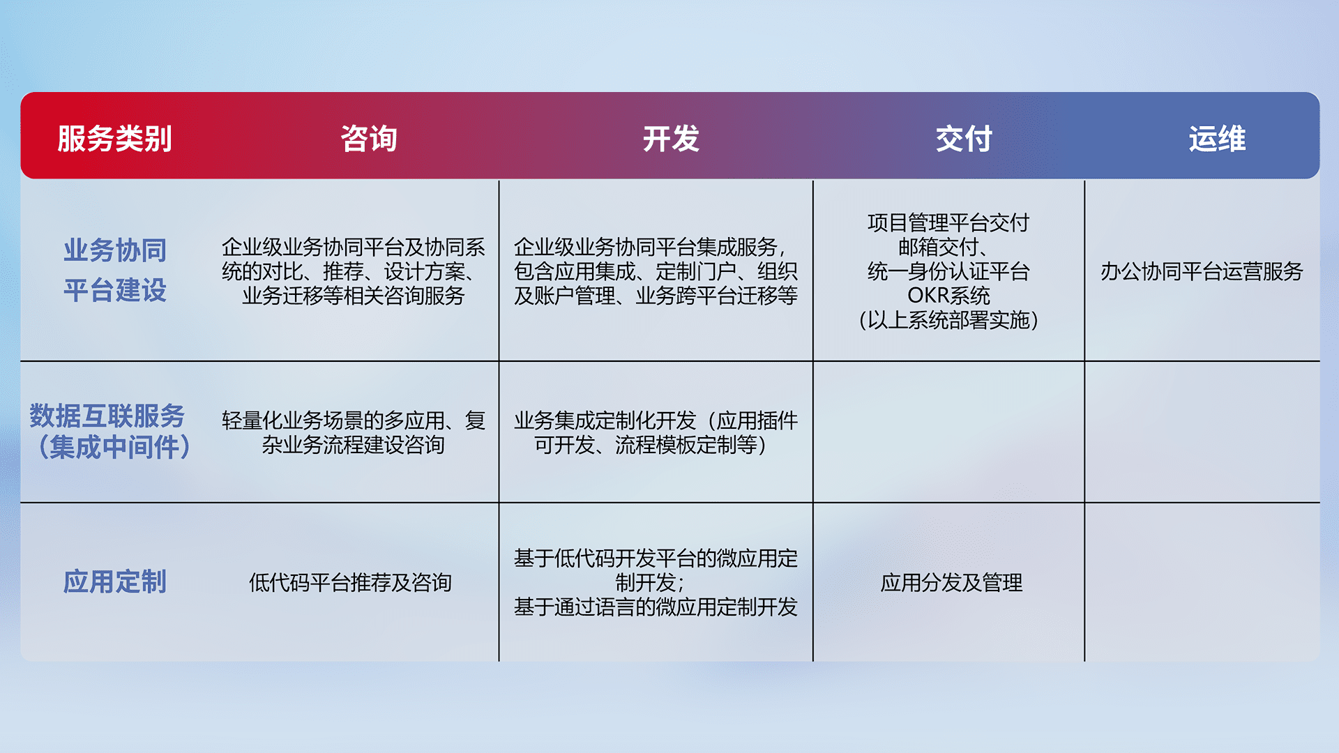 针对钉钉、、、企微、、、IDaas等平台级产品提供产品的规划、、、方案、、、、交付、、、定制化开发等服务,,实现如统一协同办公、、智能客户服务、、、混合会议管理、、、、智能数据查询、、、等业务场景,,,实现数字化转型。。。。